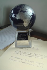 Last week I had the honor of being the recipient of the Glen at Hiland Meadows President’s Award. For the last several years, my twelfth graders have interviewed this retirement community’s residents. One student is paired off with an individual whose life story is then documented by the student. An interview is conducted, transcribed, and then researched; a paper is produced that adds an important aspect of the story of World War II and the Great Depression to the historical record, a story that otherwise would have been lost. One copy is then sent to the state archives. The kids and the elders bond and learn a great deal from each other. My kids have produced two hundred plus folders of material and I am now in the process of sorting it all out for professional articles.