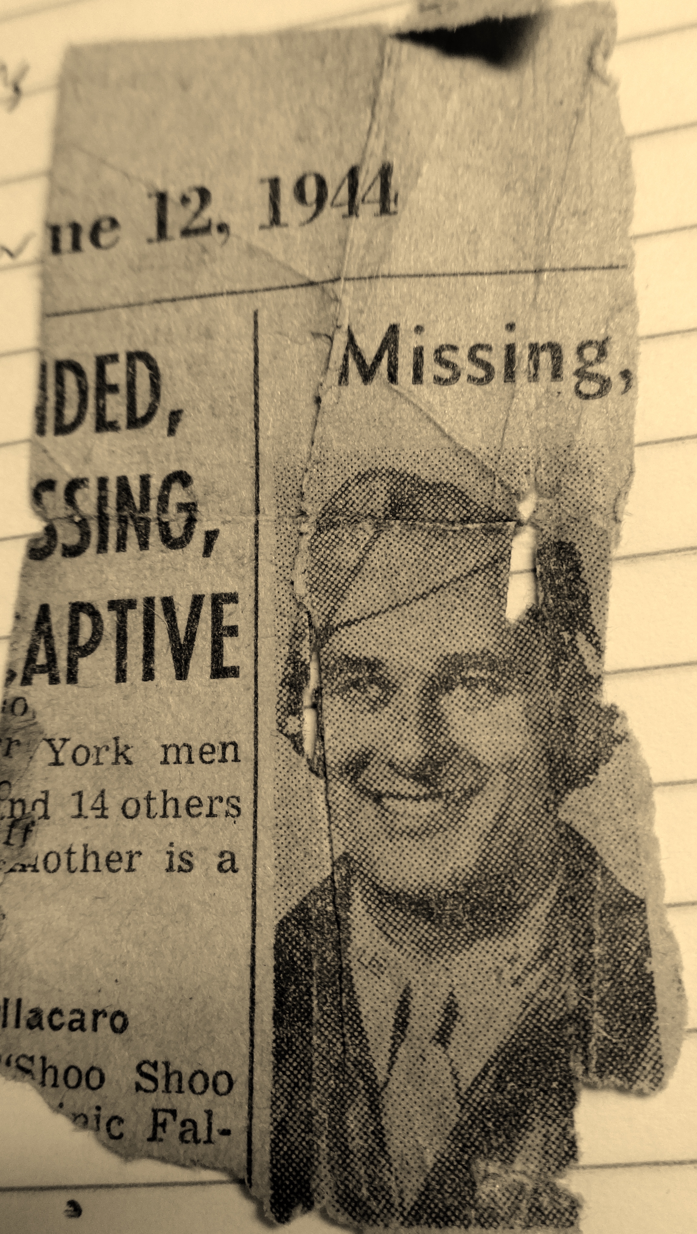 Or when Dom began to tell me about his cousin, who shared the same name as he, from Buffalo, NY, who was killed in 1944 in Europe. His wife Grace pulled a tattered newspaper clipping out of the scrapbook, one that Dom carried in his wallet for years. Dom told me that he was lying down and one of his tentmates from Buffalo was reading the newspaper from home, and tossed it over to him, telling him that “he” had died. Shocked, he clipped his cousin’s death notice and carried it in his wallet for the rest of the war. When Dom started to tell me the story, I knew that a WW II era New Yorker with the same name from Buffalo had died, as I had done some on-line research on Dom before coming to the interview. So I told Dom his cousin had been in the Army Air Corps. He nodded and then we connected the cosmic dots.