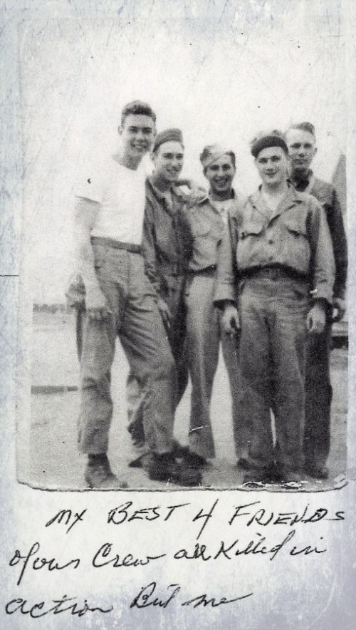 I had never seen this photo before it was sent to me in the mail two summers ago. In fact, all of my life I thought that the man who sent it to me was dead, like everyone else in the picture. Even as I began my book discussing this tragic event, I had assumed everyone in my dad’s cousin’s B-17 was killed when their plane blew up 20,000 feet over Nazi Germany in the summer of 1944.