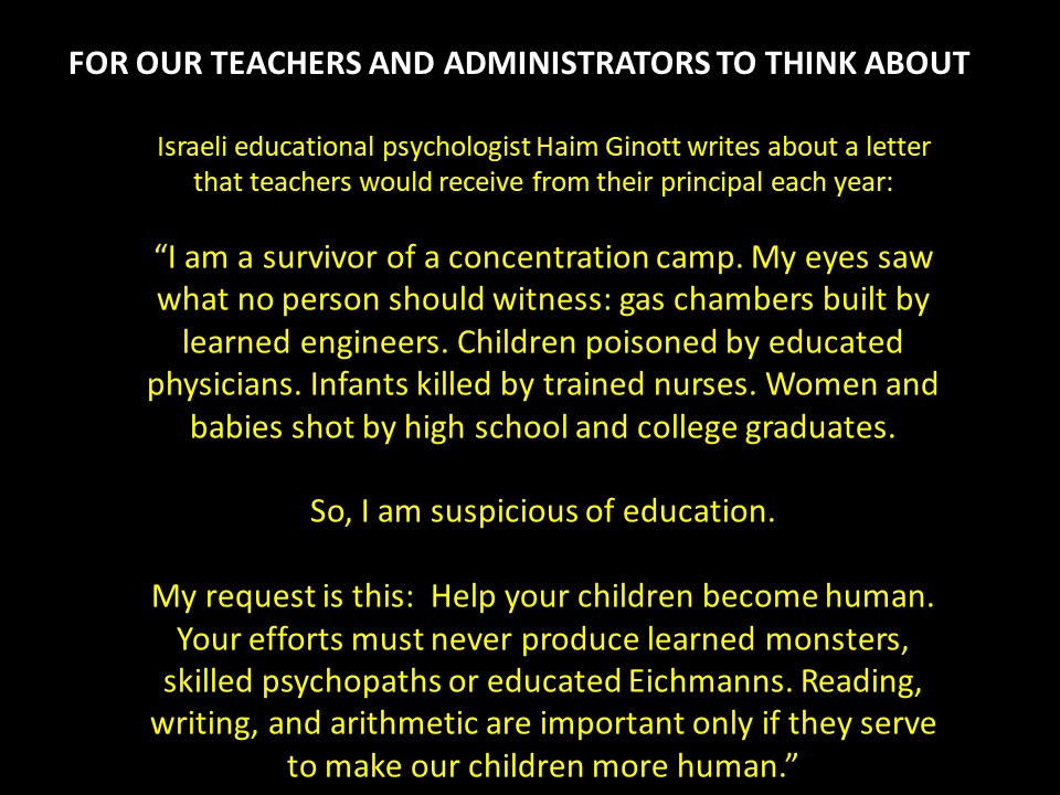 Okay, so I didn’t write this to knock the teaching profession. I’m a champion of you, was one of you for thirty-plus years. I get the part where teachers resent having instructional time pulled, being told once again they have to attend an out of classroom happening not of their own making or choice. But come on. You’re supposed to be setting an example here. At least make the effort to sit though it with your kids. Attentive. Especially given the topic.