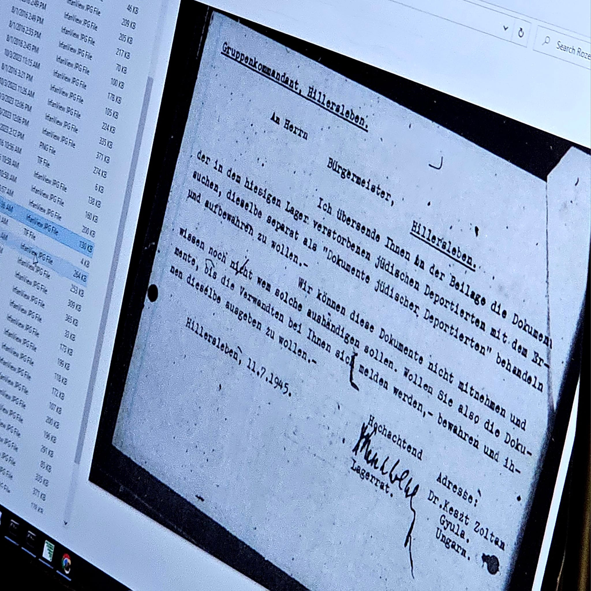 Steven tells me today that we have had over 150 correspondences since 2008 when I first approached his desk, mainly with him doing the deep dives into the documentation archives that opened up since that date. In 2016, at my request, he began to follow the documentation of Eva and her family, survivors desperate to get out of the DP camps. An American soldier compiled a list of the dead in the Hillersleben mass cemetery grave, including Eva, anxious that it not be lost as the Americans pull out due to planned post Yalta Soviet occupation. It is that 1945 list that preserved the names of those buried in Hillersleben, as evidenced by the plaque we found there when we visited in 2022.