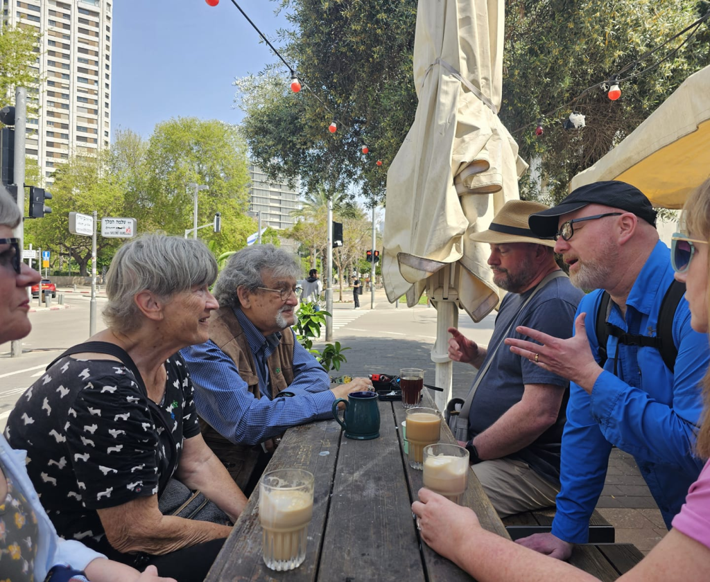 I am here with filmmaker Mike Edwards, crew Joe Hammers and Josh Fronduti, scriptwriter Lee Shackleford and his wife Karen and my wife Laura. Our mission is to interview a dozen Holocaust survivors of the train near Magdeburg. We landed on Shabbat, the sabbath day morning. Ben Gurion airport in Tel Aviv was very quiet.