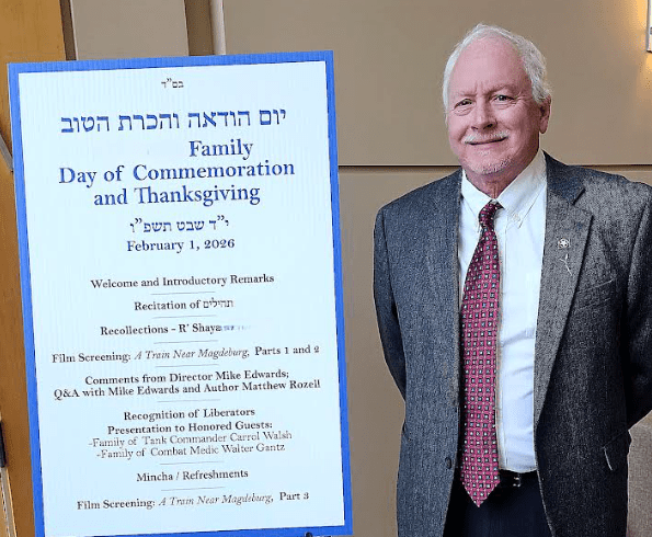 There was profound appreciation for the soldiers’ side of the story from the survivors’ multiple generations. My wife spoke to a family who had driven all the way down from Toronto, Canada, and as the second part of the film began, Laura reminded me that it was the anniversary of George Gross’s passing. That’s right! It was fifteen years ago that day! A time for reflection, the liberator’s Yahrzeit. It was also our son’s 28th birthday; and the event reminded me a bit of the thanksgiving event set up by my friend (and survivors’ daughter) Varda in Israel 15 years ago this year, where my son dutifully took pictures for me as a newly minted thirteen-year-old to celebrate the arrival of liberator Frank Towers on Israeli soil. Fifty-five survivors were in attendance that day!