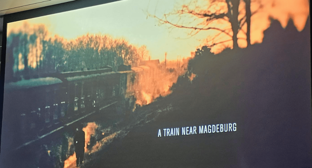 We had arrived the night before the Sunday afternoon event. I slept poorly, fitful periods of waking that left me exhausted, and the brutality of the February cold and wind had really worn me down; I dont think it was nerves, but on some restless, anticipatory level I felt like I was a part of an event that was bringing together a family that I really did not even know, but was somehow connected to. I didn’t know what to expect, but we walked into a welcome that was warm and joyous. Mike was there to allow this family gathering, many of whom had never met one another, and most who had never heard of this liberation event, the opportunity to preview a working draft of the film, A Train Near Magdeburg.