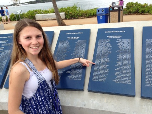 A 16 year old from our small town finds the 18 yr old from our small town at Pearl Harbor. Taken at USS Oklahoma Memorial, Pearl Harbor, 3-27-2013. Note Arizona Memorial in background.