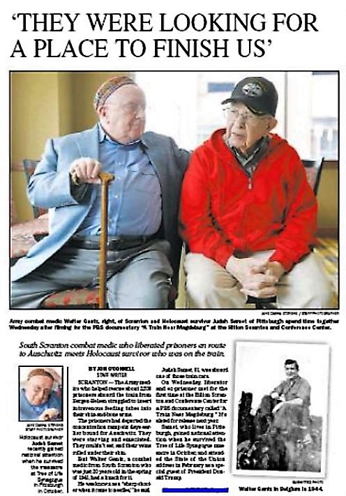 SCRANTON — The Army medics who helped rescue about 2,500 prisoners aboard the train from Bergen-Belsen struggled to insert intravenous feeding tubes into their skin-and-bone arms. The prisoners had departed the concentration camp six days earlier bound for [Theresienstadt in German-occupied Czechoslovakia]. They were starving and emaciated. They couldn’t eat, and their veins rolled under their skin. But Walter Gantz, a combat medic from South Scranton who was just 20 years old in the spring of 1945, had a knack for it. He was known as a “sharp shooter when it came to needles,” he said.