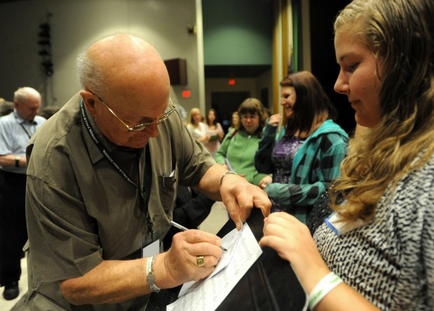 Holocaust survivor Leslie Meisels, left, signs a program for Hudson Falls senior Taylor Bump during Wednesday’s “Remembering the Holocaust, Repairing the World” event. Meisels, who currently lives in Toronto, stressed the importance of relaying his experience to young people “so they remember and fight against discrimination, hatred and injustice.”