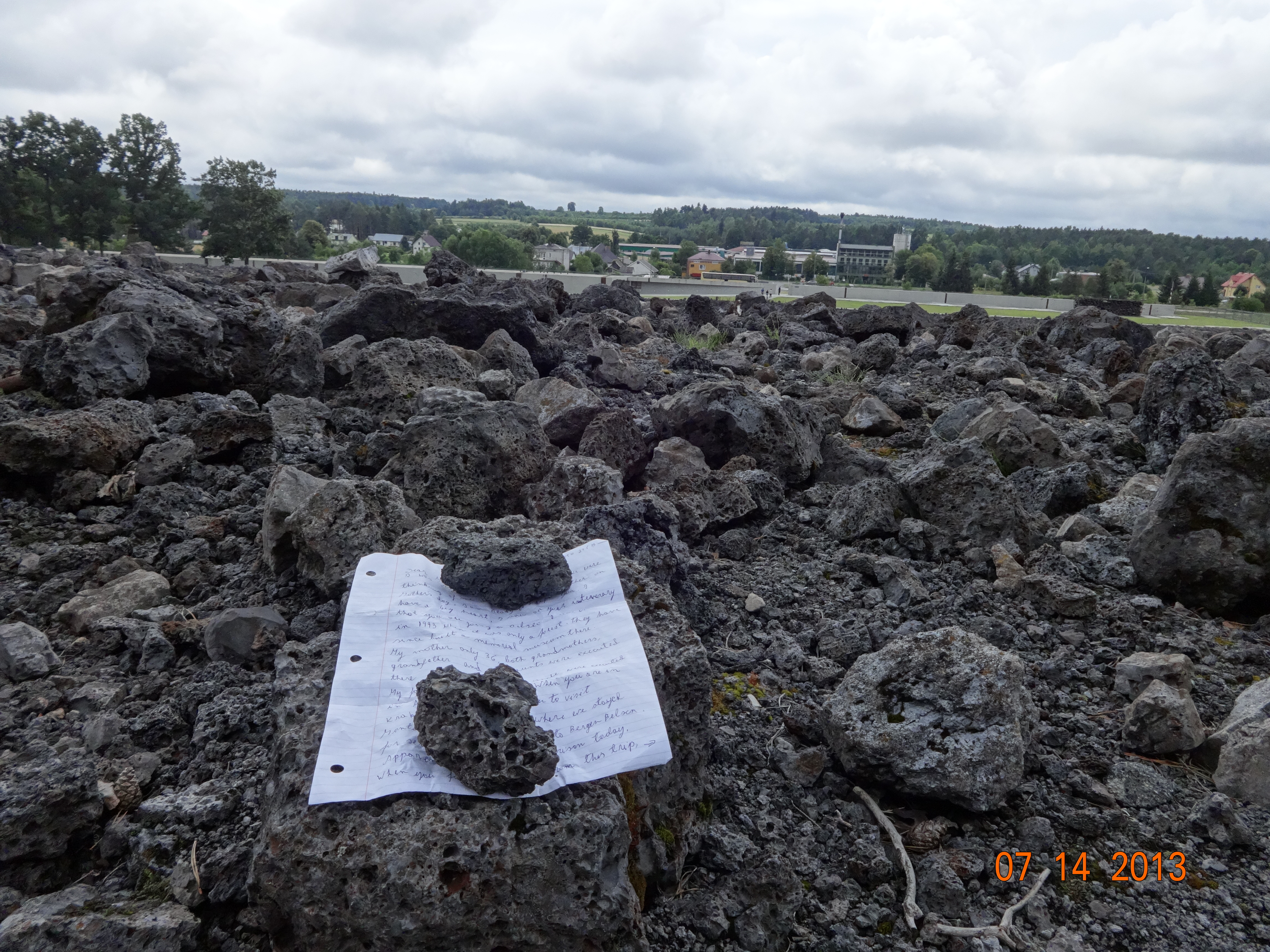 I unfold the letter and step out into the volcanic type rocks imported here to build the memorial. I am setting up my own memorial.
