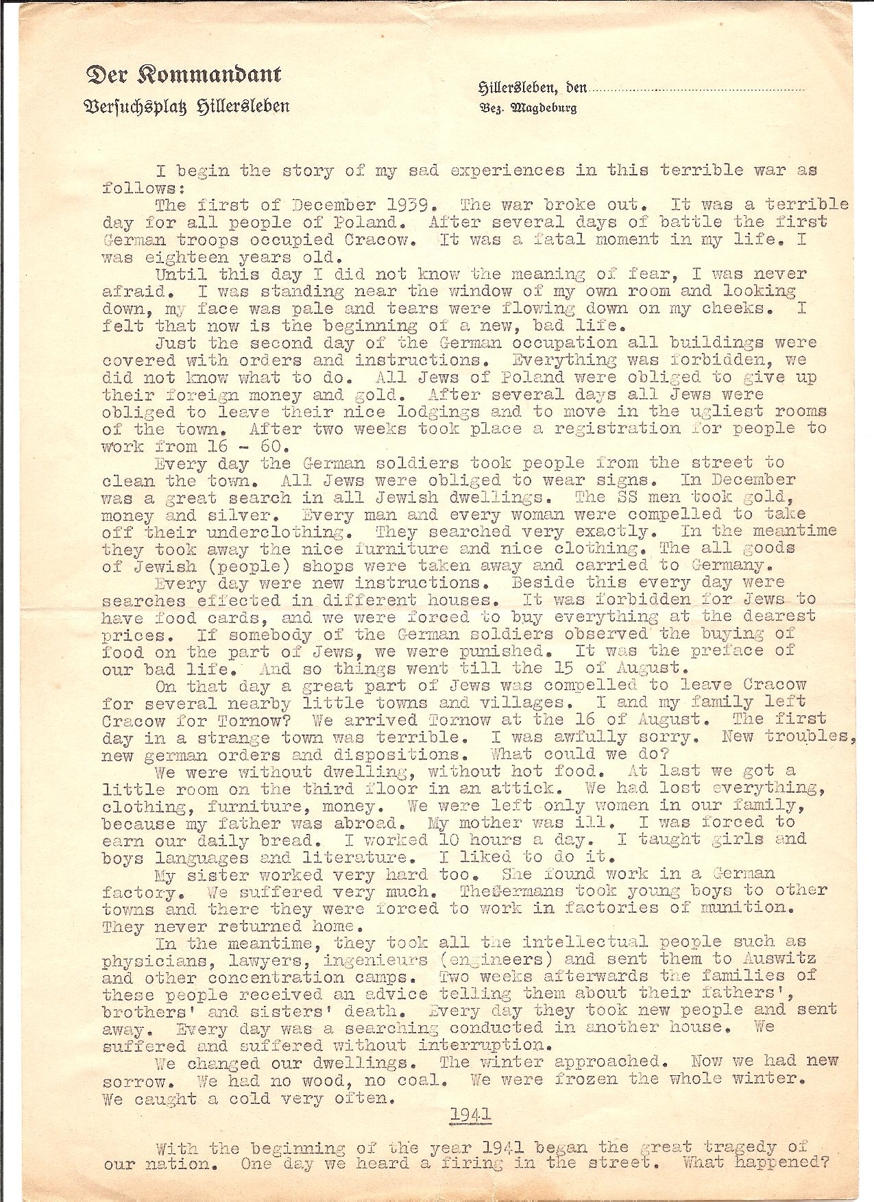 An internet search led a manuscript collector to my site. A five page typewritten document, written on the stationary and letterhead of the Nazi camp commandant at Hilersleben following the liberation of the Farsleben train in April 1945, traces the autobiographical journey of the Jewish girl from Krakow and the horrors, and miracles, that befell her. And yes, we did identify positively the author, who was still alive when the dots were connected.