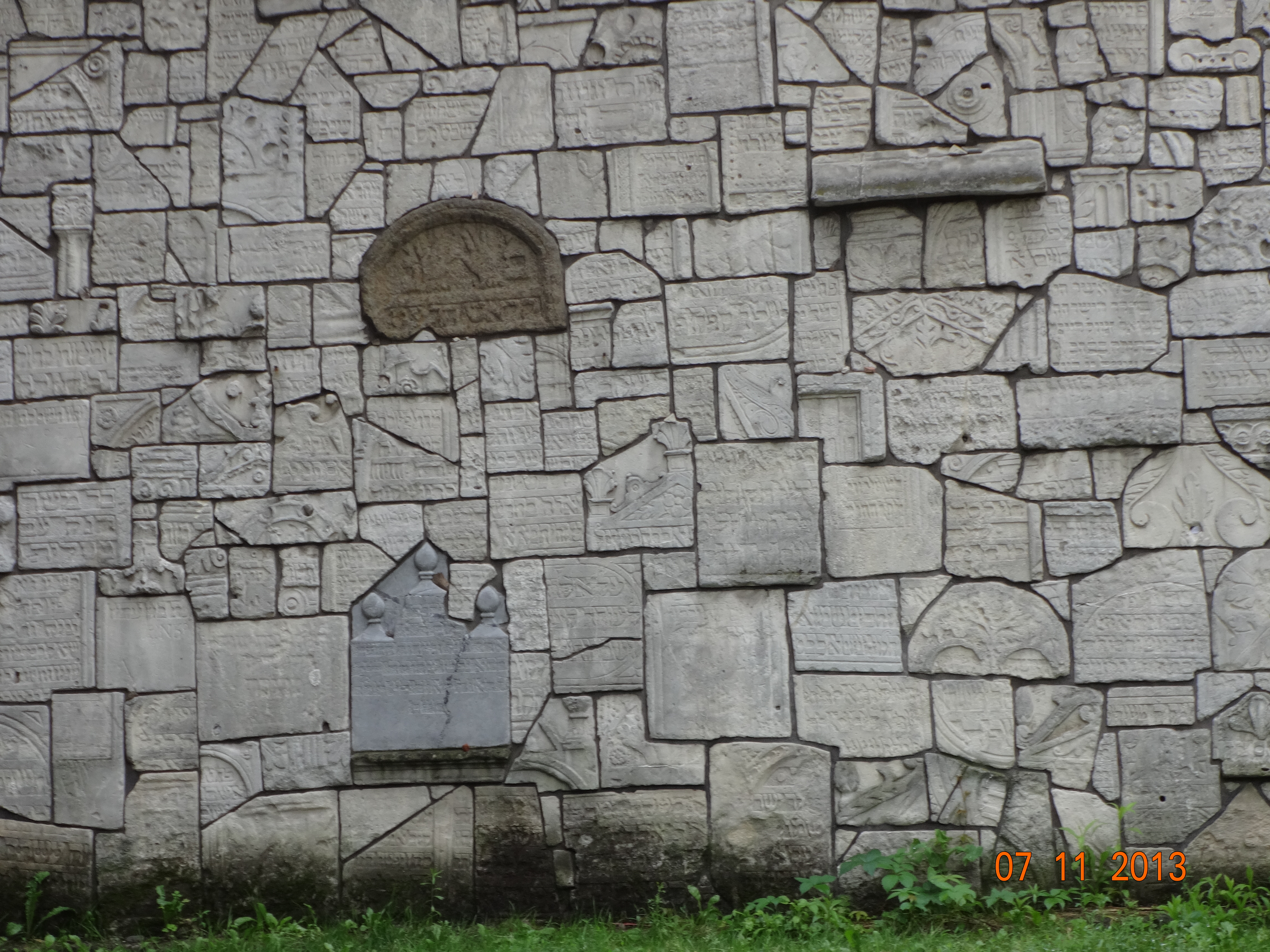 Restored Jewish Cemetery. Remuh. Wall constructed with gravestones destroyed by the Nazis.
